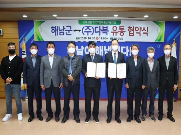 해남군은 대형 전복유통업체인 ㈜다복과 업무협약을 체결하고, 수산물 유통에 상생 협력해 나가기로 했다.
