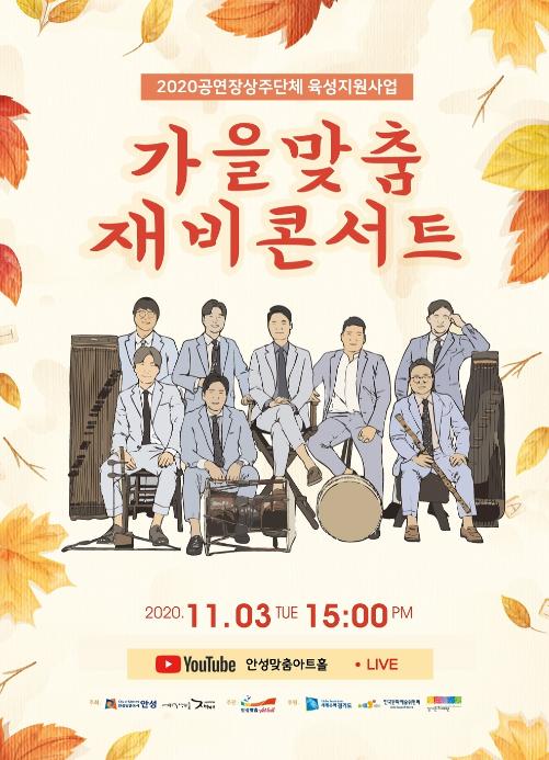 안성 시민과의 첫 인사는 11월 3일 낮 3시에 안성맞춤아트홀 야외특설무대에서 펼쳐지는 ‘가을맞춤 재비콘서트’다. 가을 정서에 맞는 재비의 곡들을 추려 가을 분위기를 느낄 수 있는 야외 공연으로 진행되며, 안성맞춤아트홀 유튜브를 통해 중계되는 온라인 공연으로 누구나 관람할 수 있다.