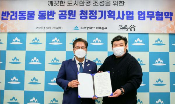 인천 미추홀구는 29일 사회적기업인 ㈜밸리스와 반려동물 동반 공원 청정기획사업에 대해 업무협약을 체결했다.