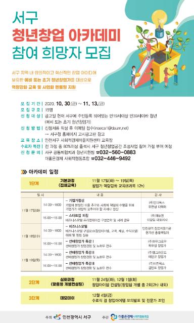 모집대상은 공고일 현재 서구에 주민등록이 되어있는 만19세 이상 만39세 이하 청년(예비 또는 초기 청년 창업가) 15명이며 모집기간은 30일부터 다음 달 13일까지이다.