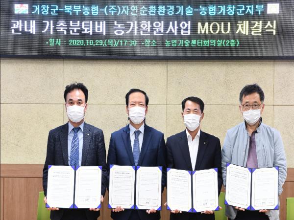 거창군은 지난 29일 농업기술센터에서 농협중앙회 거창군지부(지부장 최병철), 북부농협(조합장 이진욱), ㈜자연순환환경기술(대표 전성준)과 관내 가축분퇴비 농가 환원사업 업무협약을 맺었다.