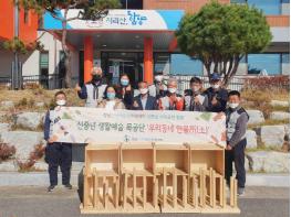 우리동네목공만물제작소(대표 정해길)는 10월 30일 백전면을 방문하여 목공예품인 코로나 방역물품비치함 16개와 장화꽂이 25개를 만들어 전달하였다.
