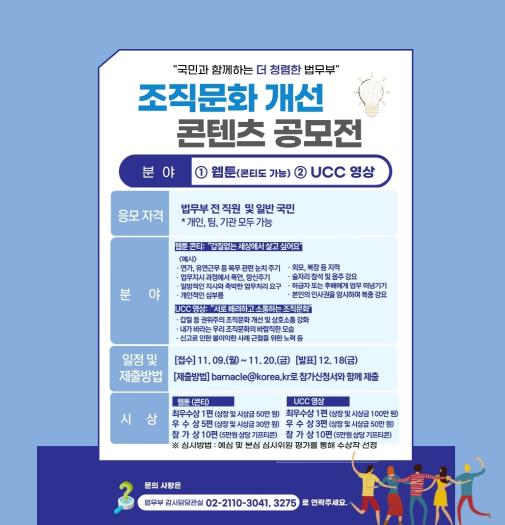 법무부는 갑질을 근절하고 보다 서로 소통하고 배려하는 조직문화를 만들기 위해 조직문화 개선을 위한 웹툰 등 콘텐츠 공모전을 개최한다고 밝혔다.