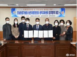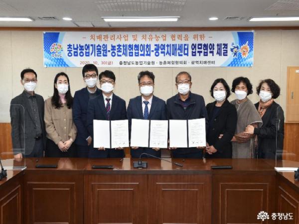 충남도 농업기술원은 30일 기술원 회의실에서 충청남도농촌체험협의회, 충청남도광역치매센터와 ‘치유농업을 활용한 치매관리 사업 활성화 업무협약’을 맺었다.