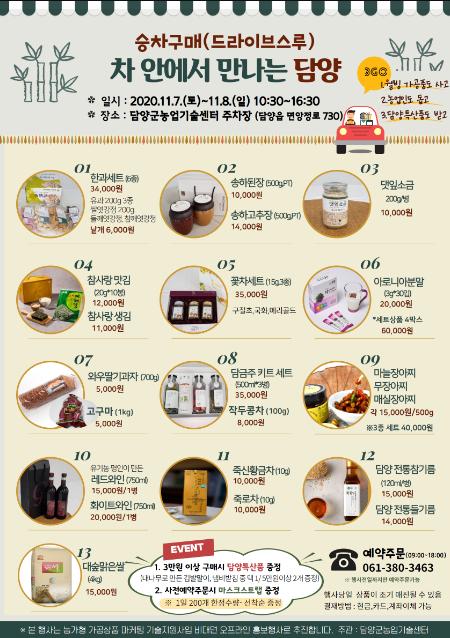 소비자는 홍보용전단지에 실린 상품들을 사전예약하여 행사당일 담양군 농업인이 직접 만든 가공 상품을 눈으로 확인 후 차량에 탄 채로 코로나19 걱정 없이 안전하게 받을 수 있다. 3만원 이상 구매 시 담양특산품을 증정하며, 사전예약 주문시에는 마스크 스트랩도 증정한다. 사전예약은 11월 6일까지 가능하다.