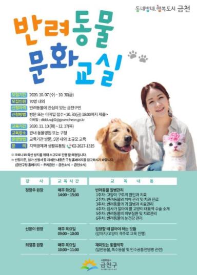 금천구 수의사협회 3명 수의사가 매주 화요일 오후 2시~3시 ‘반려동물 질병관리’, 매주 목요일 오전 9시~10시 ‘입양할 때 알아야 하는 것들’, 오전 10시~11시 ‘재미있는 동물의학’을 주제로 강의를 실시한다.