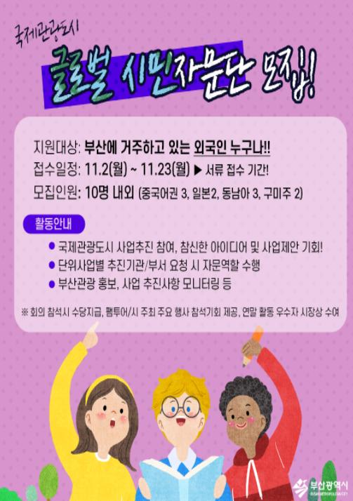 부산시는 국제관광도시 육성사업을 본격적으로 추진함에 앞서 수요자 관점에서의 정책개발과 자문 기능을 강화하기 위해 「국제관광도시 글로벌 시민자문단」을 모집한다고 밝혔다.