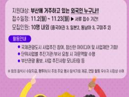 참여를 원하는 외국인 시민은 11월 2일부터 23일까지 부산시 관광포털 비짓부산 홈페이지(https://visitbusan.net)에서 신청서를 내려받아 작성 후 전자우편(aglyia@korea.kr)으로 신청하면 된다.