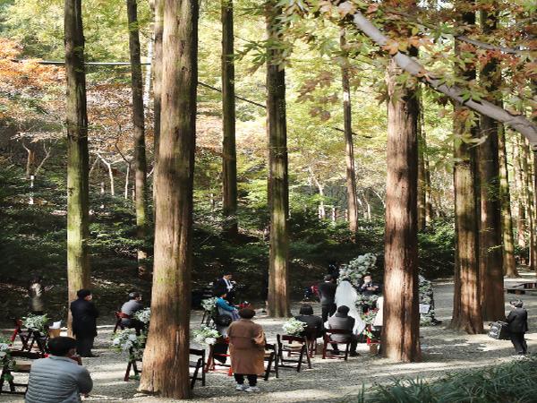 대전 서구가 추진하는 ‘사랑의 결실, 작은 결혼식’을 통해 지난달 30일 장태산 자연휴양림 메타세콰이어 숲에서 제2호 커플이 탄생했다고 2일 밝혔다.
