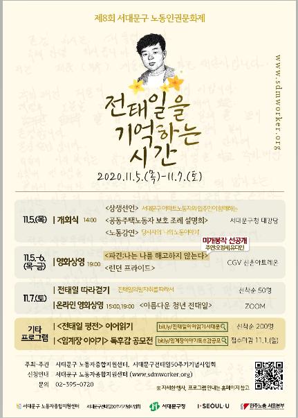 또한 7일 오전 10시부터는 전태일기념관, 전태일동상, 전태일다리, 명보다방 등 전태일과 관련된 지역을 탐방하며 해설을 듣는 ‘전태일 따라걷기’가 열린다. 사회적 거리두기를 위해 1조에 최대 5명씩 총 50명이 참여할 수 있다.