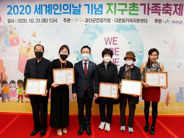 다문화여성의 권익보호와 다문화 사회적응 및 군민인식 개선에 기여한 공로로 윤관로 씨(불정면, 75세), 오오이노리꼬 씨(칠성면, 60세/일본), 서연선 씨(괴산읍, 42세)가, 어려운 여건 속에서도 행복하고 모범적인 다문화가정을 이뤄 다문화가족의 지위향상에 기여한 공로로 김동옥 씨(감물면, 80세), 꽁완다 씨(청천면, 40세/캄보디아)가 괴산군수 표창패를 받았다.