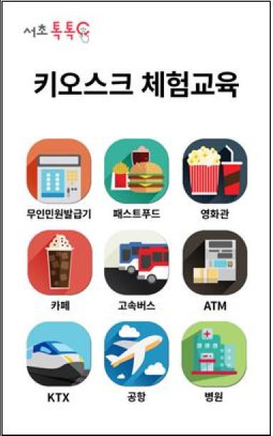 어르신 전용 음성안내 키오스크 교육용 앱은 기존 고정형 대형 키오스크를 통한 체험교육의 한계를 극복하려는 노력의 일환으로, 지난해 서초구에서 전국최초로 개발한 9종의 키오스크 교육 콘텐츠(무인민원발급, 패스트푸드, 영화관, 카페, 고속버스, ATM, KTX, 공항, 병원)를 바탕으로 앱 개발이 이루어 졌다.