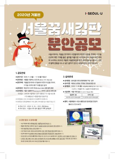 2020년 겨울을 앞두고, 서울시는 시민들에게 따뜻한 마음을 전하며, 다가올 신년에 대한 기대를 품은 글귀를 주제로 한 ‘서울꿈새김판 문안 공모’를 11월 16일(월)까지 ‘서울시 홈페이지’(seoul.go.kr)접수 및 우편접수로 진행한다.
