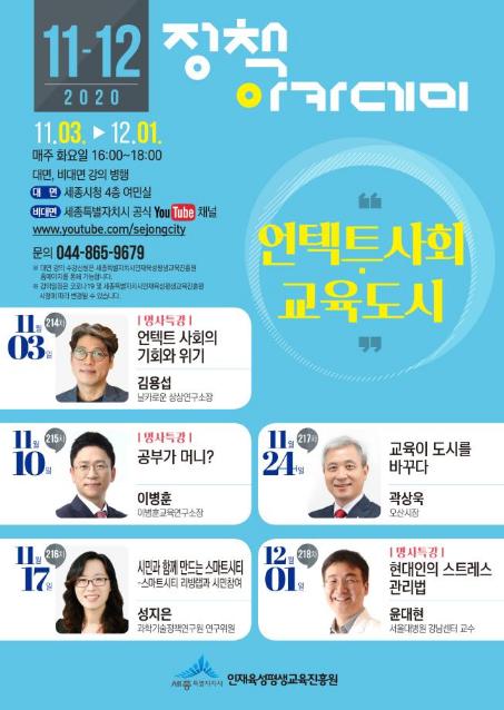 11월 정책아카데미는 ‘언택트사회·교육도시’를 주제로 3일부터 12월 1일까지 매주 화요일 오후 4시에 진행되며, 세종시 공식 유튜브 채널(www.youtube.com/sejongcity)에서나 시청 방문을 통해 참여할 수 있다.