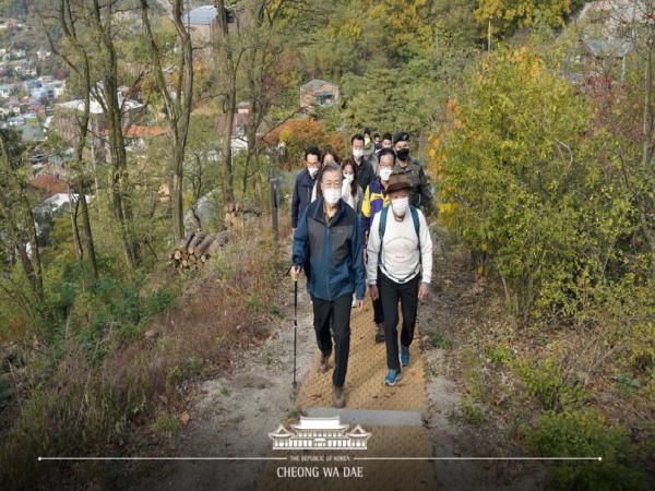 문재인 대통령은 북악산 개방(11.1)을 하루 앞둔 31일 산악인 엄홍길 대장, 배우 이시영 씨, 부암동 주민 등과 함께 북악산 성곽 북측면 둘레길을 따라 산행했다.