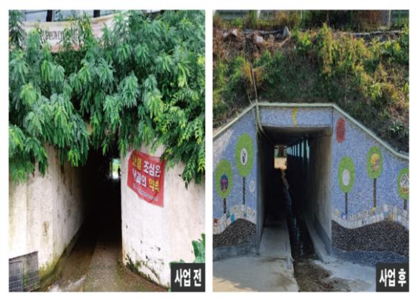 ‘진잠동 굴다리 안심길 디자인 사업’은 노후된 굴다리를 주민들이 함께 디자인해 안전한 보행환경을 조성하는 사업이다. 마음쉼터 심심풀이는 굴다리에 친근한 마을분위기를 더하기 위해 양쪽 입구에 그림타일을 부착하고, 주민들이 안전하게 굴다리를 이용할 수 있도록 태양광 패널을 설치해 상시 점등상태를 유지할 수 있도록 했다.