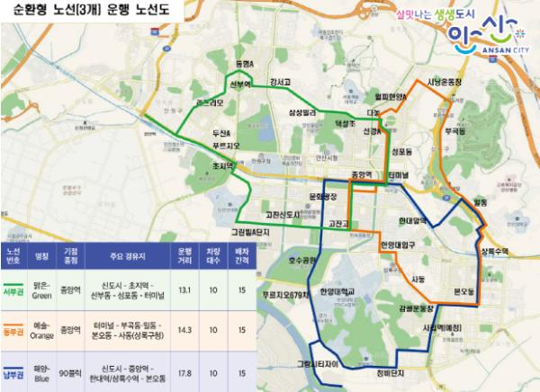 순환버스는 ▲맑은-Green(서부권) ▲예술-Orange(동부권) ▲해양-Blue(남부권) 등 3개 권역으로 나뉘어 안산시 전역을 누빈다.