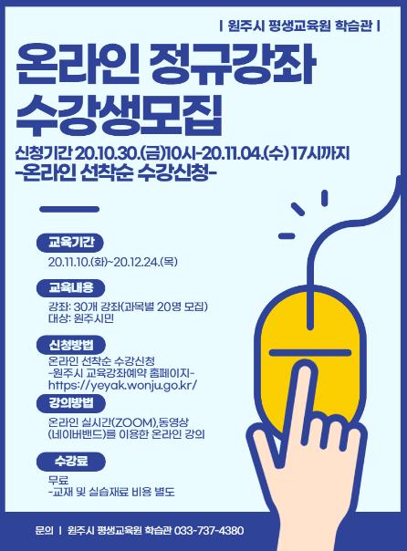 수강생은 11월 4일까지 원주시 교육강좌예약 홈페이지(https://yeyak.wonju.go.kr/)에서 강좌별로 선착순 접수한다.