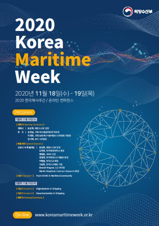해양수산부는 11월 18일부터 19일까지 서울 임페리얼 팰리스호텔에서 ‘2020 한국해사주간(Korea Maritime Week)’을 개최한다.