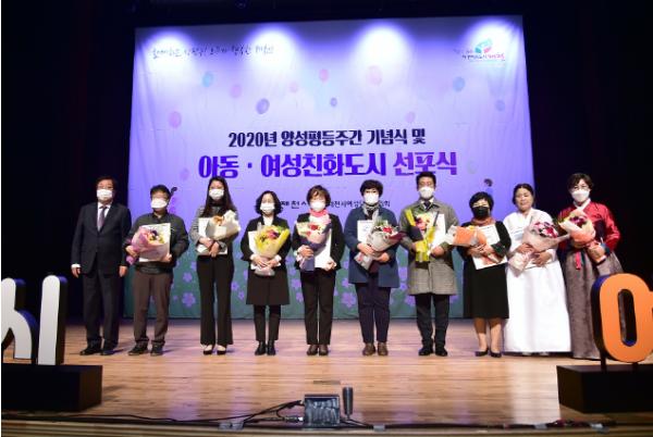 먼저, 양성평등 유공에는 채희숙, 이선경, 조홍연, 김정숙 님이 아동·여성친화도시 유공에는 최치욱, 백영숙, 신미하, 이은아 님이 수상하였으며, 여성일자리 창출 및 가족친화적인 기업환경 조성에 기여한 여성 친화기업에는 (주)태경식품과 (주)휴메딕스가 수상했다.