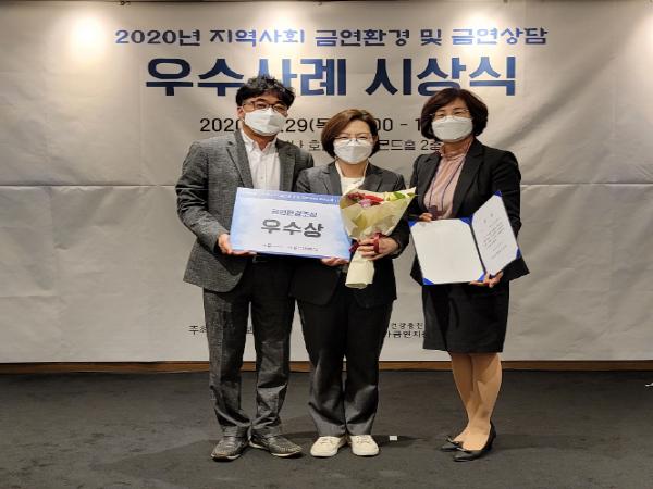 군은 지난 10월 29일 보건복지부와 한국건강증진개발원 국가금연지원센터에서 주관하는‘2020년 지역사회 금연환경조성 및 금연상담 우수사례 평가대회’에서 우수기관 상을 수상했다.