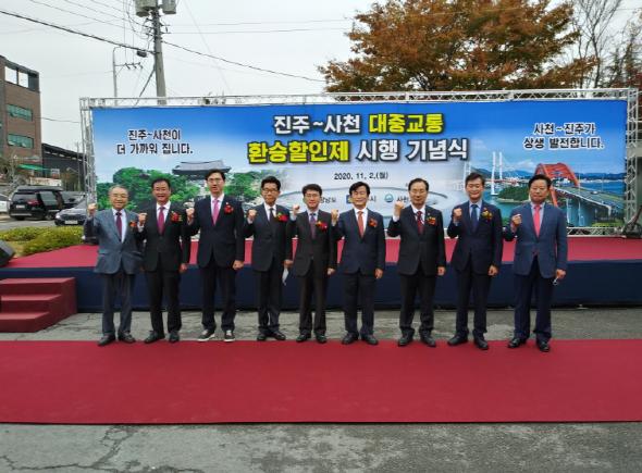 경남도는 진주시와 사천시를 오가는 시민들의 교통비 절감 혜택이 이루어지는 광역환승할인제 시행을 기념하기 위해 11월 2일 오전 10시 30분 진주 정촌면사무소에서 기념행사를 열고, ‘진주-사천 간 광역환승할인제 본격 시행’을 알렸다.
