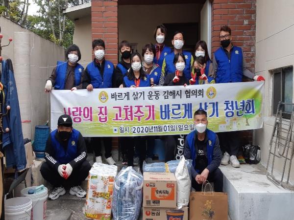 바르게살기운동 김해시 협의회 청년회는 매년 1세대에 집수리 봉사활동을 진행하고 있으며 이뿐만 아니라 연탄나눔 봉사활동 및 생필품 전달 등 어려운 이웃을 돕는 활동을 꾸준히 진행하고 있다.