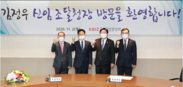 11월 2일자로 제36대 조달청장으로 부임한 김정우 청장이 취임 후 첫 현장행보로 중기중앙회를 방문해, 김기문 중기중앙회 회장을 만나 중소기업 지원방안을 논의했다.