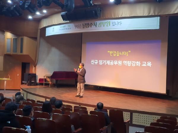 남양주시는 2일 다산홀에서 신규 임기제공무원 58명을 대상으로 방역수칙을 준수하며 대면 집합교육을 진행했다고 전했다.