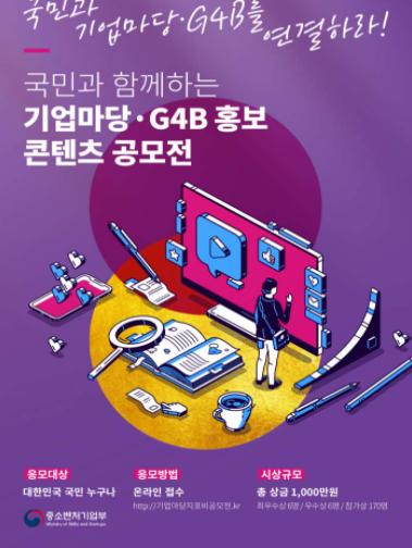중소벤처기업부는 기업지원 정책정보 검색 ‘기업마당’과 상호·업종 변경 처리 등 행정업무를 손쉽게 할 수 있도록 도와주는 비대면 온라인 서비스 '지포비(G4B)'를 널리 알리기 위한 ‘기업마당·지포비(G4B) 콘텐츠 공모전’ 접수를 11월 2일부터 시작한다고 밝혔다.