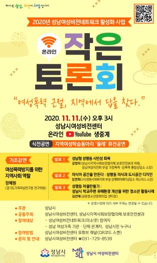 성남시는 오는 11월 11일 오후 3시~5시 ‘여성 폭력 근절, 지역에서 답을 찾다’를 주제로 한 온라인 토론회를 연다.