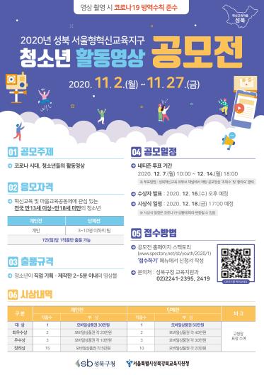 서울 성북구가 '2020 성북 서울형혁신교육지구 청소년 활동영상 공모전 - 코로나 시대, 청소년들의 활동영상’을 개최한다.