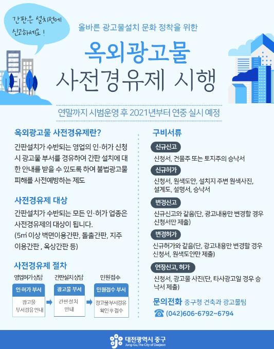 이번 사전경유제는 연말까지 시범운영 후 2021년부터는 연중 실시할 예정으로, 영업주는 영업 개시 전 광고물을 합법화해야 허가?신고가 수리된다. 구비서류 등 자세한 문의사항은 중구청 건축과(☎606-6792)로 하면 된다.