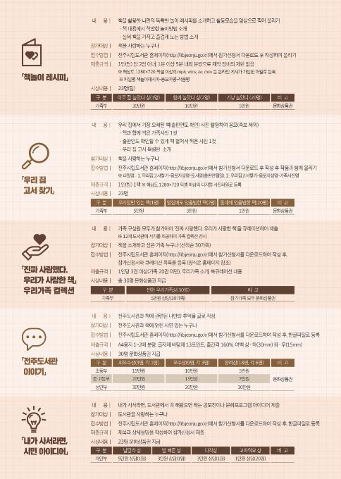 ‘우리가족 컬렉션’은 가족 구성원들이 소개하고 싶은 책들의 목록을 제출하는 프로그램이며, ‘전주도서관 나만의 이야기’는 도서관과 책에 얽힌 나만의 추억과 에피소드를 A4용지 1~2매 분량의 글로 작성해 접수하면 된다. 일례로 도서관을 내 집처럼 드나들던 학창시절 이야기나 취업준비생의 희비가 엇갈리던 씁쓸한 이야기, 갈 곳 없어 방황하던 내가 안착할 수 있었던 도서관 공간 이야기 등 자유롭다.