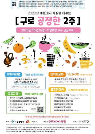 행사에는 구로마을대학, 구로고 사회적협동조합, 구로시민두레 생협, 구로아이쿱 생협, 사단법인 두리하나 다울, 영림중 사회적협동조합, 함께배움 사회적협동조합, 한살림 구로점, 마을에서 함께 크는 아이들 협동조합 등이 참여해 공정무역 관련 전시, 슬로건 공모, 제품 체험 등의 프로그램을 진행한다.
