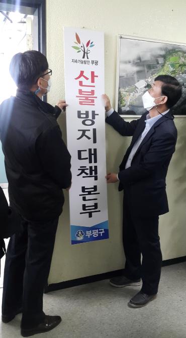 부평구는 지난 2일 ‘2020년 가을철 산불조심기간(11월 1일~12월 15일)’을 맞아 구청 공원녹지과 내에 산불방지 대책본부를 마련하고 현판식을 진행했다.