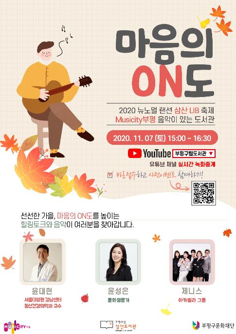 ‘마음의 ON도’는 유튜브 부평구립도서관 채널을 통해 실시간 녹화중계되며, 삼산도서관 홈페이지를 통해 참가신청 및 사전이벤트에 참여할 수 있다.