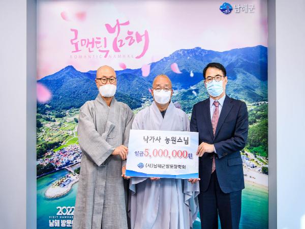 같은 날 낙가사 능원스님(전 보리암주지) 역시 군수실을 방문해 지역 후학양성에 보탬이 되고자 장학금 500만 원을 기탁했다