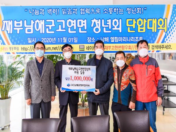 재부남해군고현면청년회(회장 김성환)는 1일 100만 원의 장학금을 기탁했다. 단합대회를 위해 고향 남해를 찾은 재부남해군고현면청년회는 좀 더 의미있는 일을 하고 싶어하는 회원들의 뜻을 모아 장학금을 기탁하게 됐고, “앞으로도 고향 후배들의 인재 양성에 조금이라도 보탬이 되도록 다방면으로 노력 하겠다“는 뜻을 전했다.