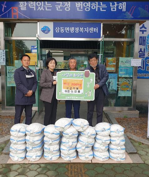 남해군 삼동면 시문마을 이대홍 이장이 2일 관내 어려운 지역주민에게 전달해 달라며 백미 300kg을 삼동면행정복지센터에 기탁했다.