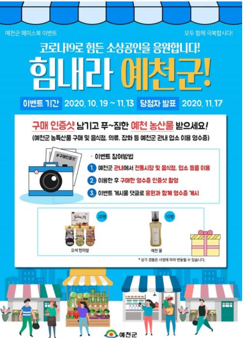 이번 이벤트는 누구나 참여 가능하며 예천군 농?특산물을 구매하거나 관내 전통시장, 음식점, 의류, 잡화 등 상가를 이용한 영수증을 사진으로 찍어 군 공식 페이스북 이벤트 게시물에 댓글로 응원과 함께 게시하면 된다.