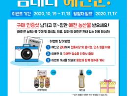 예천군은 코로나19 장기화로 외출 자제, 모임 금지 등 각종 사회활동이 위축 되면서 직?간접 피해를 입고 있는 군민들을 응원하고 지역 경기 활성화를 위해 11월 13일까지 SNS 이벤트를 진행한다.