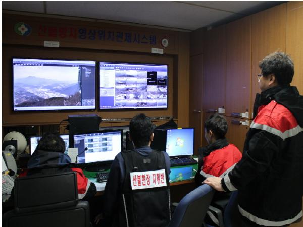 27개의 감시 카메라를 2명의 감시원이 상시 모니터링하며 관내 주요지점 11개소에 초소를 운영해 입체적인 산불감시를 하고 있는 중이다.
