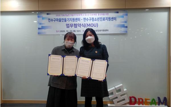 인천시 연수구 마을만들기지원센터와 연수구청소년진로지원센터는 지난 10월 29일(목) 지속가능한 마을자치 공동체와 청소년 진로체험 활성화를 위한 공동협약을 맺었다.