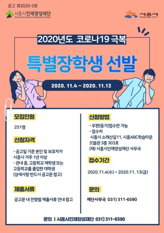 (재)시흥시인재양성재단은 2020년 11월 4일부터 11월 13일까지(10일간) 2020년도 코로나19 극복 특별장학생 선발을 위한 접수를 진행한다고 밝혔다.