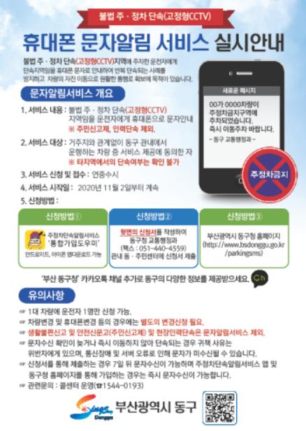 부산시 동구는 2일부터 불법 주정차 단속 문자 알림 서비스를 도입 운영한다고 밝혔다.