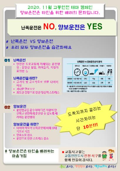 인천시 서구는 11월의 교통안전 캠페인 테마를 ‘양보 운전’으로 정하고 “양보 운전은 타인을 위한 배려의 문화입니다”라는 주제의 홍보자료를 만들어 배포한다고 3일 밝혔다.