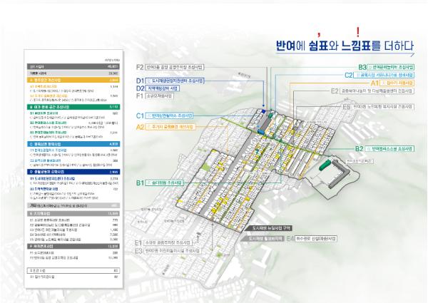 이 지역은 1972년경에 형성된 정책이주지로, 열악한 주거환경 개선을 위해 ▲폐교된 반여초등학교 별관을 활용한 일자리·문화·공동체 거점인 ‘반여플러스스쿨’▲공·폐가 정비 후 공공와이파이, 스마트 그늘막 등의 스마트 기술이 도입된 ‘숨터정원’▲어린이 돌봄·문화공간인 ‘반여문화놀이터’를 조성하고 ▲반여동 골목시장과 연계한 ‘상생협력상가’와 ‘커뮤니티 가로정비사업’등을 추진하여 골목상권 활성화를 도모할 계획이다.