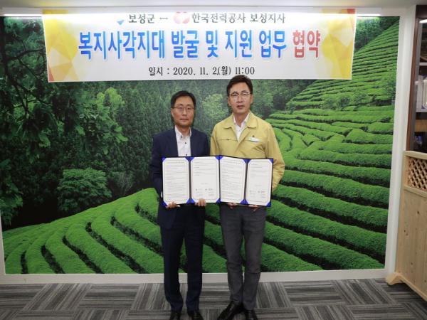 보성군은 지난 2일 군수실에서 한국전력공사 보성지사(지사장 강봉완)와 복지사각지대 발굴 및 지원을 위한 업무 협약을 체결했다.