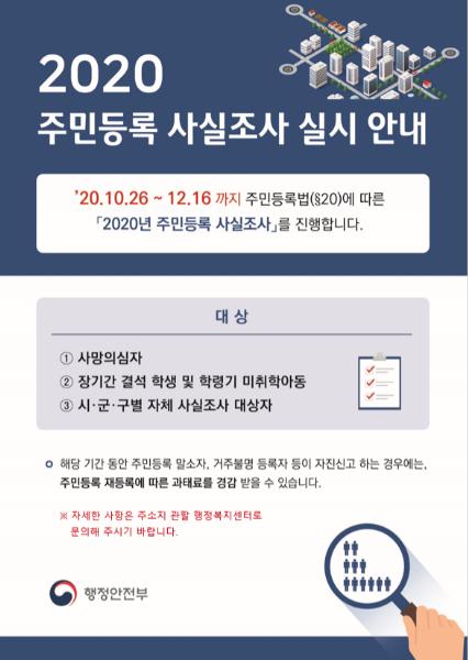 매년 주민등록사실조사는 읍·면·동별로 주민등록담당 공무원과 통(리)장이 전 세대 방문조사를 통해 무단전출자, 허위신고자는 최고·공고 등의 절차를 거쳐 직권조치하며, 말소·거주불명등록 된 자는 재등록하도록 유도하여 주민등록사항과 실제 거주사실을 일치시켜 효율적 행정 및 주민생활의 편익을 증진시키기 위해 실시된다.